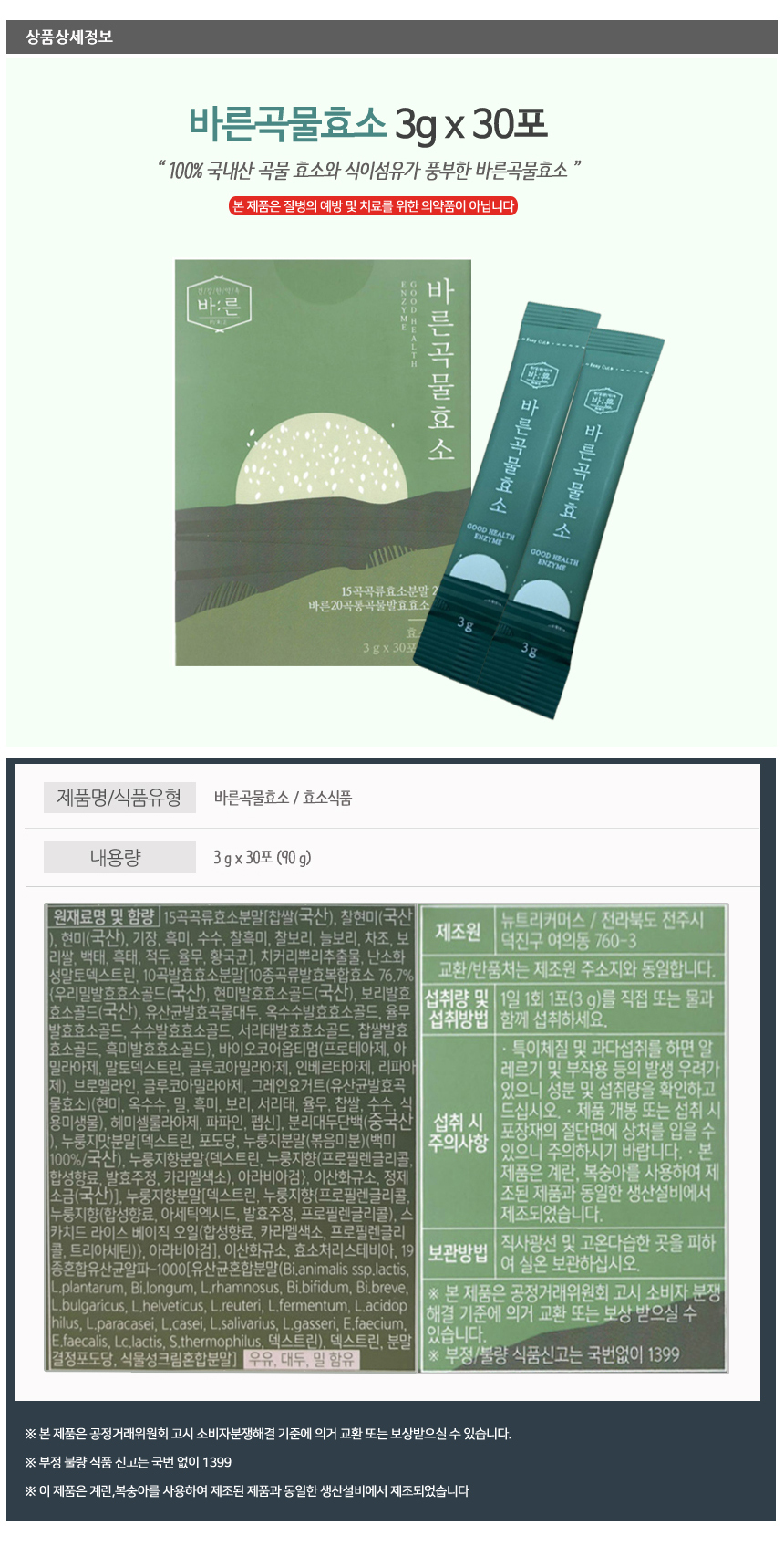 바른곡물효소 3g x 30포 x 1박스