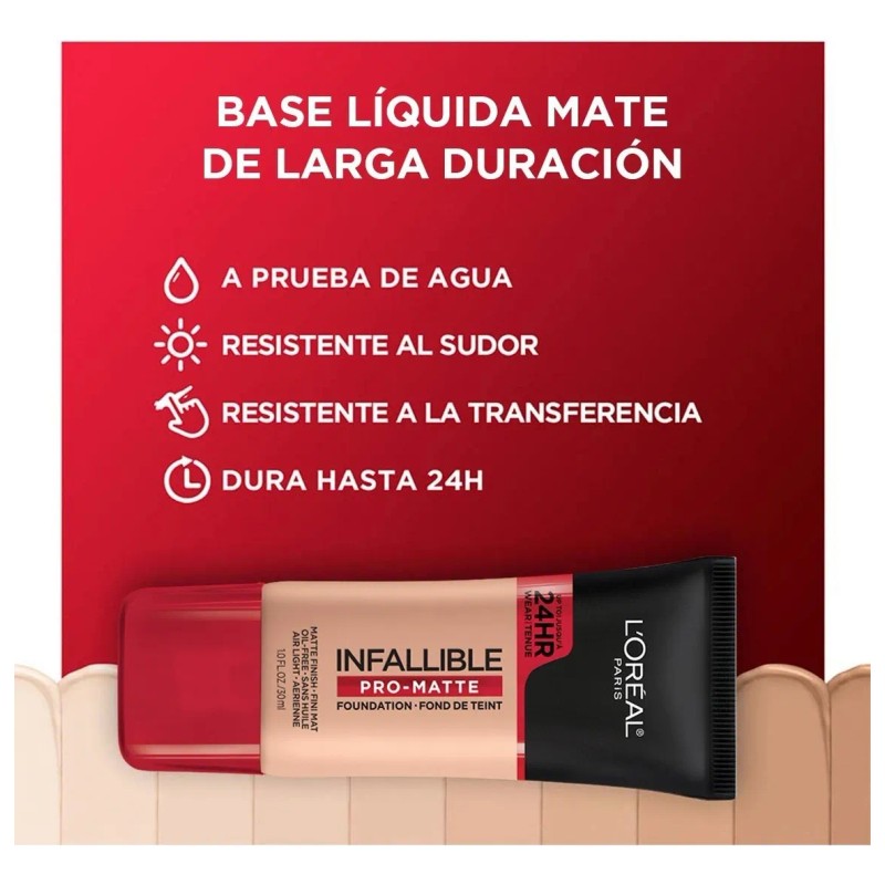 Infallible Pro-Matte es una base de larga duración y acabado Matte, ideal para pieles mixtas a grasas. Resistente hasta 24 horas, mantiene la piel sin brillos ni imperfecciones. Incorpora dos tecnologías exclusivas: Tecnología Perlita de alta absorción y Tecnología Protectora del color.