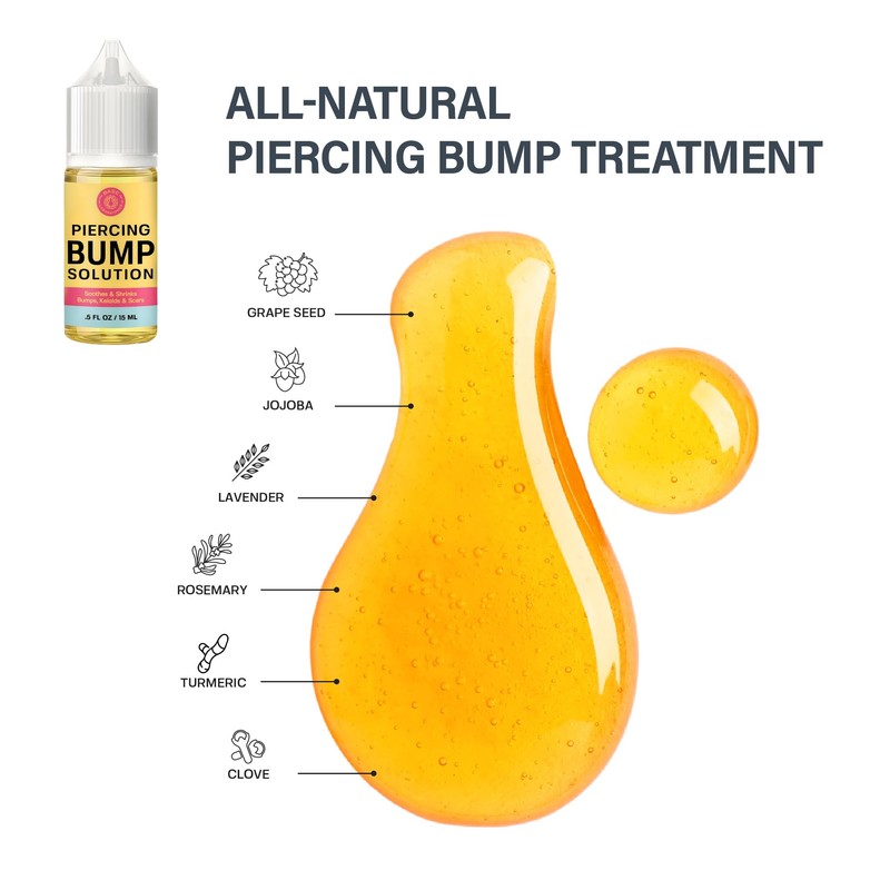 🌿 ALL-NATURAL POWERFUL INGREDIENTS in our keloid bump remover & piercing aftercare solution. For all piercings including nose, ears, belly button, nose rings etc. Formulated with the Oils of Jojoba, Grape seed, Rose & the Essential Oils of Lavender, Turmeric and Rosemary. Combined, these ingredients provide the needed relief and solution as a piercing keloid bump removal solution that can be applied throughout the healing and piercing cleaning process. Alternative to Tea Tree Oil for Piercings.