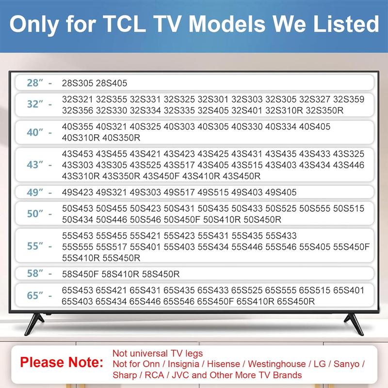 Compatible Models: TV Stand for 28" 32" 40" 43" 49" 50" 55" 65" TCL TV stand , TV base stand for TCL 28inch TV 28S305 28S405, for TCL 32inch TV 32S355 32S331 32S325 32S301 32S303 32S305 32S327 32S359 32S330 32S334 32S405 32S401 32S359, for TCL 40inch TV 40S355 40S325 40S303 40S305 40S330 40S334 40S405, for TCL 43inch TV 43S453 43S455 43S421 43S423 43S425 43S431 43S435 43S433 43S325 43S303 43S305 43S525 43S517 43S405 43S515 43S403 43S434 43S446.
