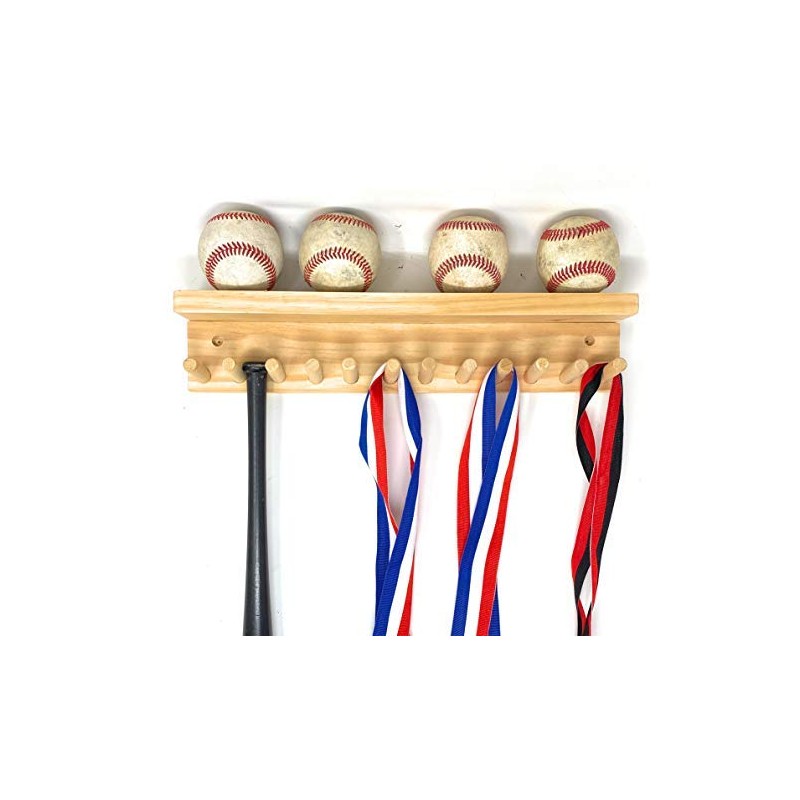 - Award Medal Display Rack and Trophy Wall Shelf 18 medals Baseball Bat Rack and Ball Holder Display Natural Finish Meant to Hold up to 11 Mini Collectible Bats and 4 Baseballs