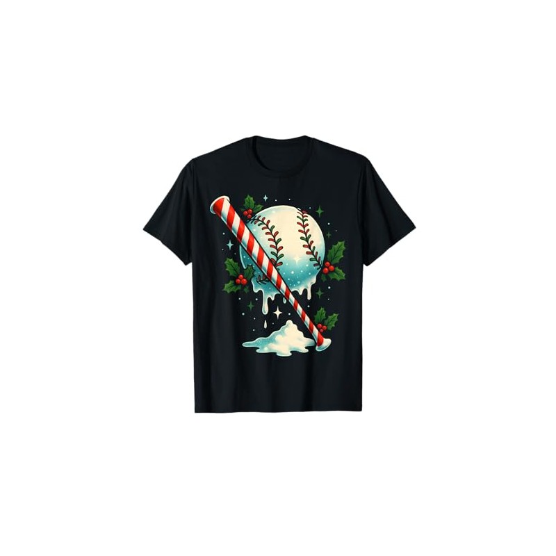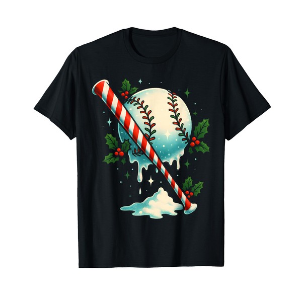 - Creative holiday design blending baseball with festive cane candy style bat, winter snow, holly leaves, and accents, perfect for fans of sports, seasonal themes, and unique alternative artwork with bold visual flair.