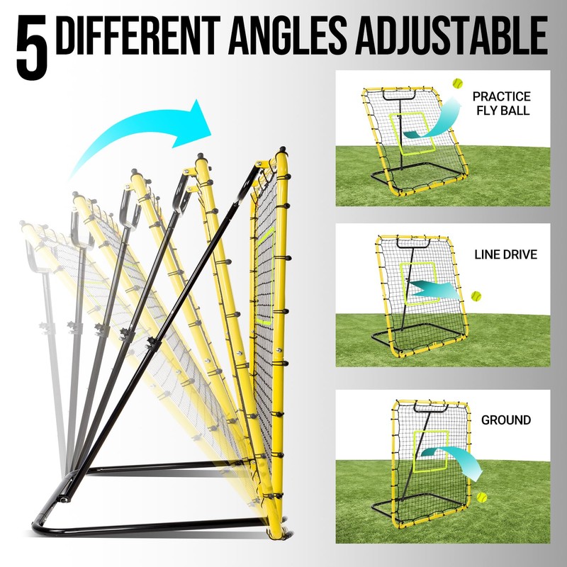 - ⚾【ANGLE ADJUSTABLE TRAINER】This baseball rebounder net is designed to easily adjusts 5 angles with the telescoping tube. let you switch grounders,line drives, or fly balls, to practice pitching, catching, and fielding anytime, anywhere, without a partner.