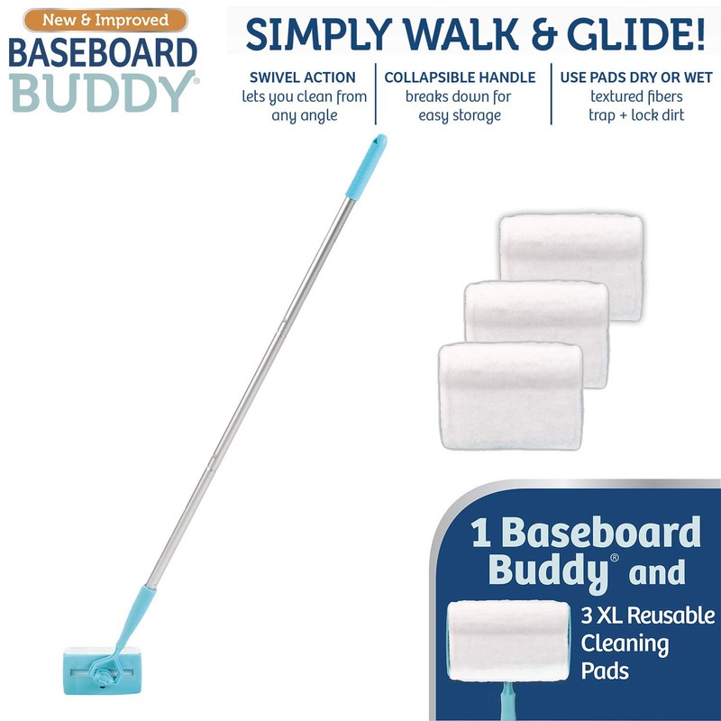 The As Seen On TV Baseboard Buddy cleaning tool is the fast and easy way to clean your baseboards and moldings! The flex head design conforms to any baseboard or door molding. The 360 degree rotating head assists in cleaning from any angle! The collapsible handle breaks down for easy storage! It also allows you to clean up top or down low! Just adjust the height to able to clean in those hard to reach places! Use wet or dry, the textured fibers on the cleaning pad traps and locks dirt leaving your surfaces clean! Just rinse to reuse! Includes 1 Baseboard Buddy with 3 Reusable Cleaning Pads.