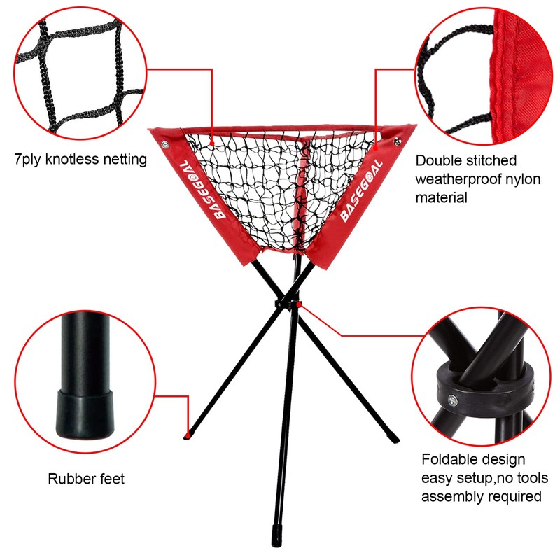 Baseball practice net is constructed with weighted base and steel ground stakesand a knotless polyester net that are extremely durable, It is suitable for all levels of people to practice baseball hitting, throwing and catching balls.