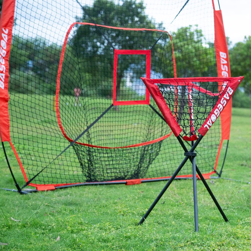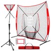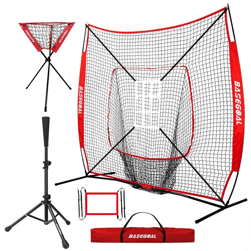 BaseGoal 7'×7' Baseball Softball Practice Net,Baseball Backstop,with Batting Tee,Ball Caddy,for Hitting Pitching Batting Catching with Bow Frame,Bonus Strike Zone,Portable and Foldable (Red)