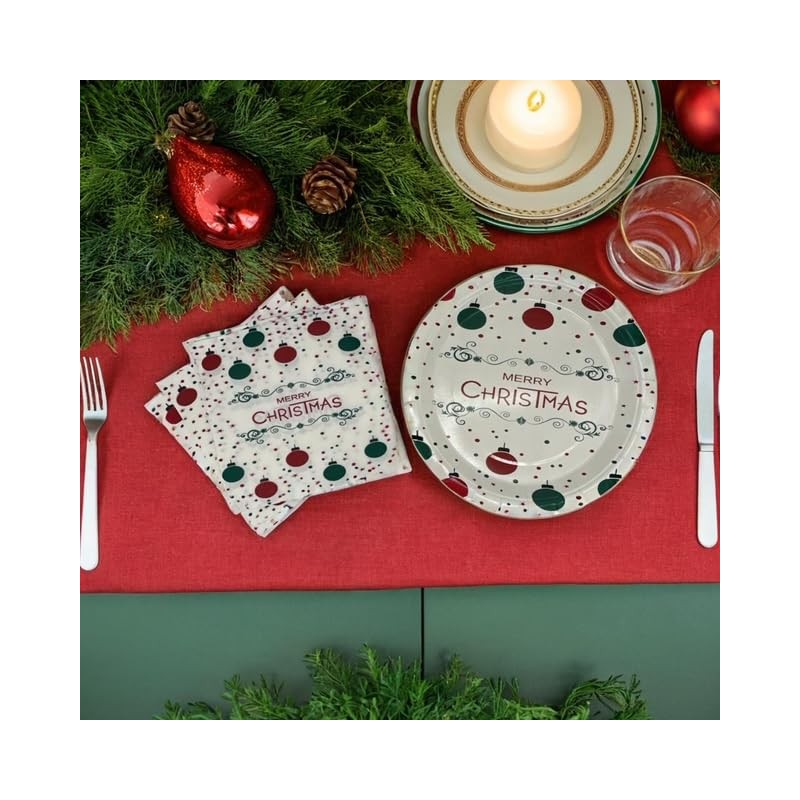 - Charming Christmas Design | Our Merry Christmas green and red ornament designed full print plates and full print large napkins are perfect for your next Christmas party | Classic Christmas glossy printed designed plates are essential when hosting lunch or dinner at home during the holidays | Festive holiday plates are perfect at home or office gatherings
