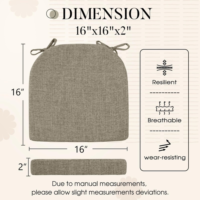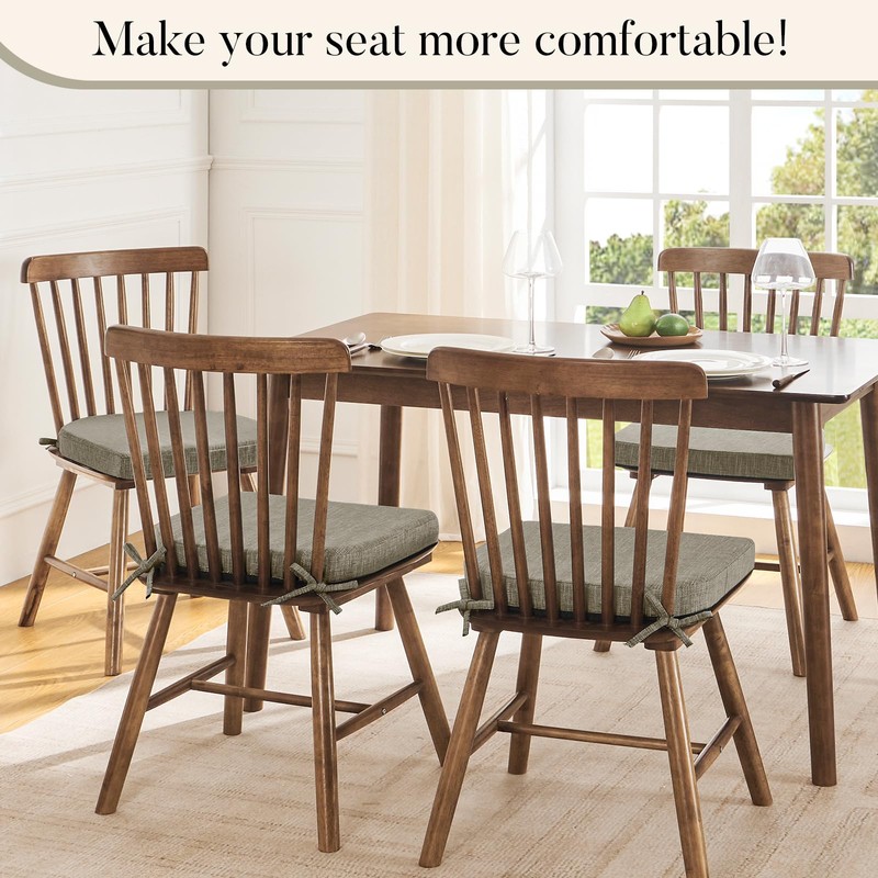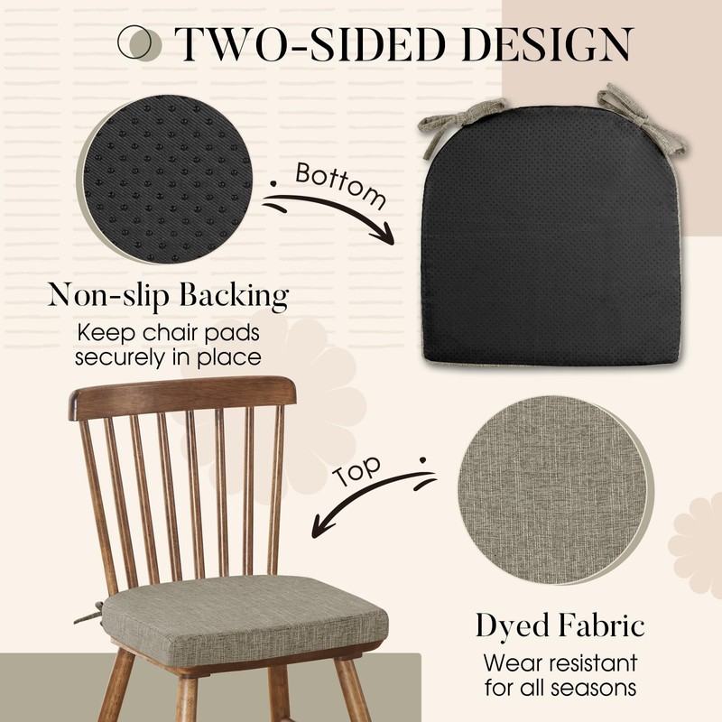 - SLIP-RESISTANT DESIGN: Our seat cushions for kitchen chairs feature a slip resistant backing to keep chair pads not slipping when sat on. Besides, there are two ties at each chair pad to keep it securely in place on any chair when guests get in or out of chair. Our double safety anti-slipping design make our chair pad a great difference from others. If the seat cushion leaves the seat when you get up, there are still two ties strap it tightly to the chair.