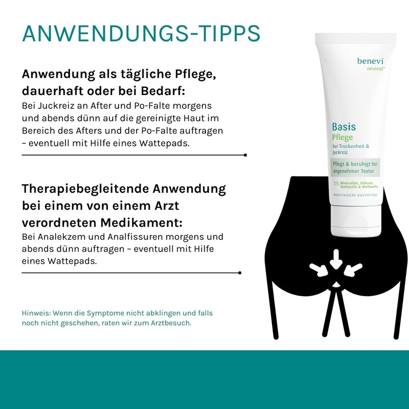 Our basic care cream has been specially developed for sensitive skin in the and buttock wrinkle area and offers optimal care to soothe and regeneration of irritated skin. The hydrophilic texture ensures quick absorption without too much greasing or straining the skin.