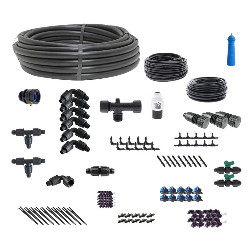 * (Qty: 5) Barb Tubing Coupling - Size : 1/2" * (Qty: 3) Irritec Perma-Loc Tubing End Cap - Perma-Loc Size : 1/2" * (Qty: 1) DIG Standard Punch - 1/4" Hole * (Qty: 1) Polyethylene Tubing - Size : 1/2" (.600" ID x .700" OD) - Length : 50' * (Qty: 10) Barb Tubing Elbow - Size : 1/4" * (Qty: 10) Barb Tubing Coupling - Size : 1/4" * (Qty: 10) Barb Tubing Tee - Size : 1/4" * (Qty: 10) Tubing Clamp with Nail - Size : 1/2" * (Qty: 10) Goof Plug - Size : 1/4" * (Qty: 25) Tubing Clamp with Nail - Size : 1/4" * (Qty: 2) Irritec Perma-Loc Tubing Tee - Size : 1/2" * (Qty: 1) 1/4" Polyethylene Dripline - Emitter Spacing : 12" - Flow Rate : 0.5 GPH - Roll Length : 100' - Color : Black * (Qty: 6) Irritec Perma-Loc Tubing Elbow - Size : 1/2" * (Qty: 1) Irritec Perma-Loc Tubing x FHTS Elbow Adapter - Thread Size : 3/4" FHT - Perma-Loc Size : 1/2" * (Qty: 1) Hendrickson Bros J10 Hose Vacuum Breaker * (Qty: 1) Tee Filter * (Qty: 1) Senninger 3/4" Hose Thread Pressure Regulator - PSI : 25 PSI * (Qty: 10) Irritec iDrop Button Dripper - Flow Rate : 0.5 GPH * (Qty: 10) 6" Micro Tube Stabilizer Stake * (Qty: 1) Polyethylene Tubing - Size : 1/4" (.170" ID x .250" OD) - Length : 100' * (Qty: 2) Irritec Perma-Loc Tubing Coupling Valve - Size : 1/2"