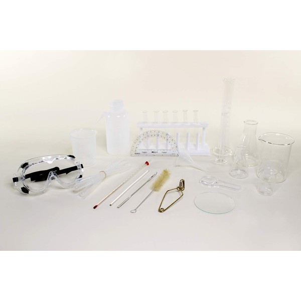 - Included: 3 Beakers - 50mL, 250mL, 400mL; 2 Erlenmeyer Flasks - 50mL, 250mL; 2 Graduated Cylinders - 10mL, 100mL; Plastic Funnel; 6 Test Tubes, 15 x 125; Test Tube Brush; Test Tube Holder; Test Tube Rack; Watch Glasses, 100mm; Safety Goggles; Spatula, Micro; Student Thermometer, -20 to 110C; Wash Bottle, plastic, 16 oz; Protractor/Ruler; 6 Dropper Pipets, 5mL; Glass Stir Rod, 8"; Hand Magnifier, 3x/6x.