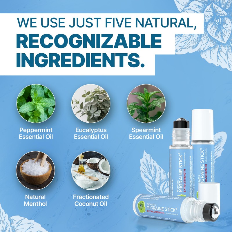 • Extra Strength Migraine Stick's crisp, fresh aroma melts away stress and cuts through migraine-related brain fog. This little stick really takes the edge off.