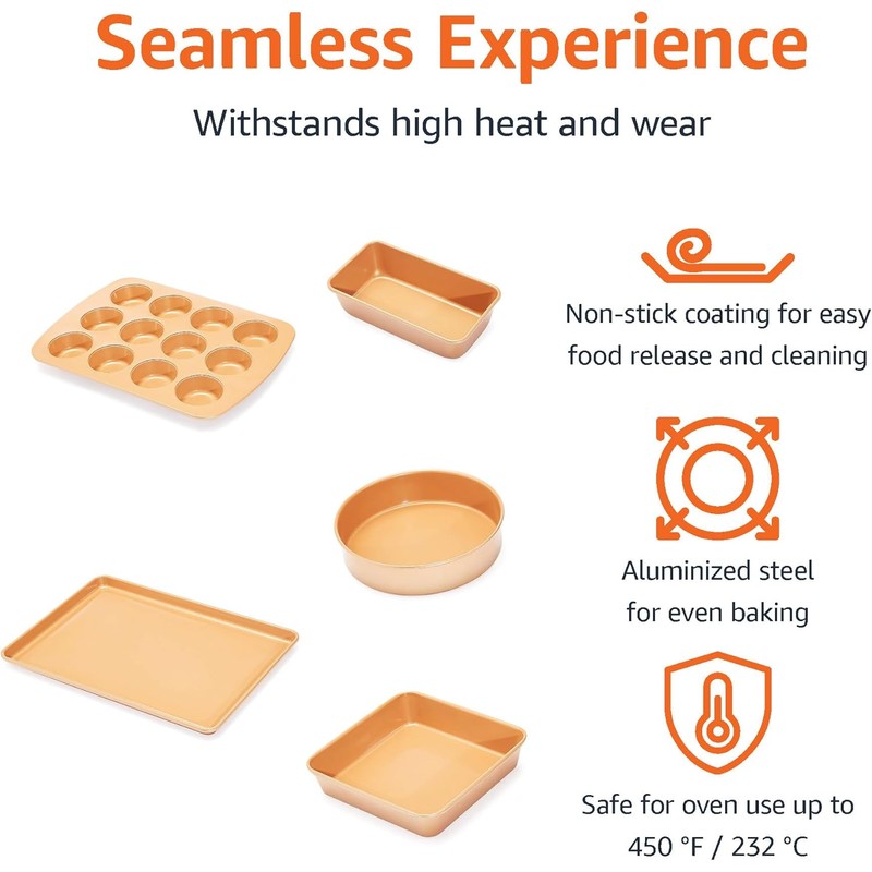 - 5-piece bakeware set with 1 large cookie sheet (39 x 26 x 2cm ), 1 loaf pan (23 x 13.2 x 5.9cm), 1 round cake pan (22 x 5.5cm) , 1 square pan (24.5 x 24.5 x 5.2cm), and a 12-cup muffin pan (39 x 27.5 x 2.85cm)