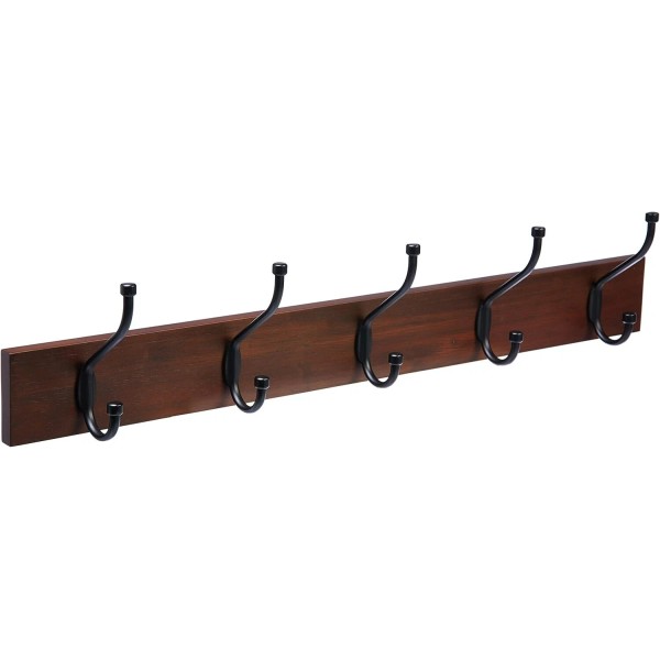 - Wall-mountable coat rack with wood base and 5 standard double metal hooks