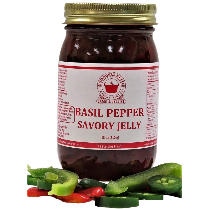 - Sugar, Red Bell Peppers, Water, Cider Vinegar, Jalapenos, Onions, Pectin, Basil, Salt.