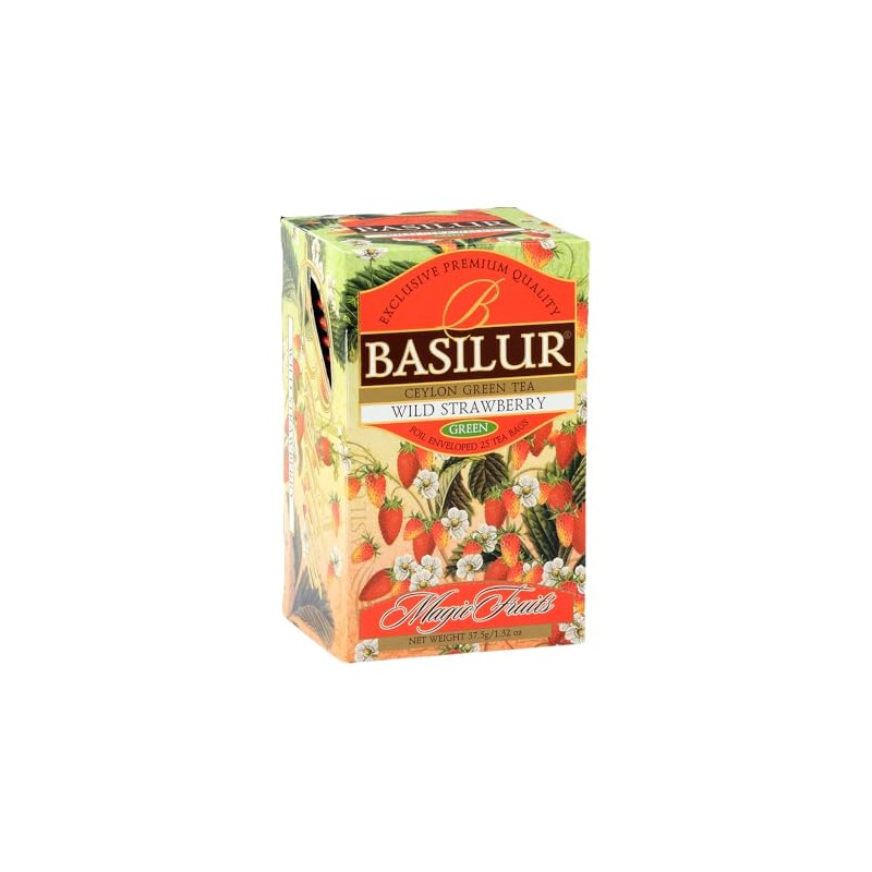 Tauchen Sie ein in den sommerlich-frischen Geschmack von Basilur Wild Strawberry, einem exquisiten grünen Ceylon-Tee, der mit dem süßen Aroma wilder Erdbeeren veredelt wurde. Dieser hochwertige Grüntee besticht durch seine sanfte, leicht grasige Note, die perfekt mit der natürlichen Süße der Walderdbeeren harmoniert. Die praktische Packung enthält 25 einzeln verpackte Teebeutel à 1,5 Gramm, die sich ideal für die Zubereitung einer perfekten Tasse Tee eignen – ob zu Hause, im Büro oder unterwegs.