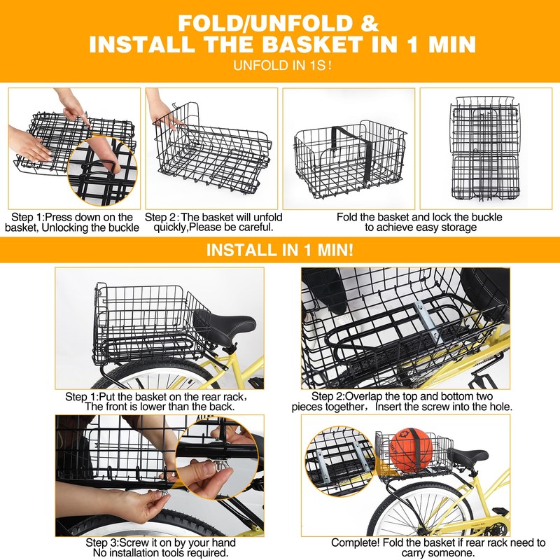 - Material: The rear bicycle baskets is forged from steel wire, which is not easy to deform, the bearing is stable, has durability and reliability.The exterior of the rear bicycle basket has a rust-resistant coating that is strong and rust-resistant.