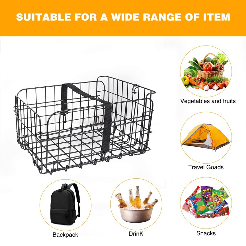 - Material: The rear bicycle baskets is forged from steel wire, which is not easy to deform, the bearing is stable, has durability and reliability.The exterior of the rear bicycle basket has a rust-resistant coating that is strong and rust-resistant.