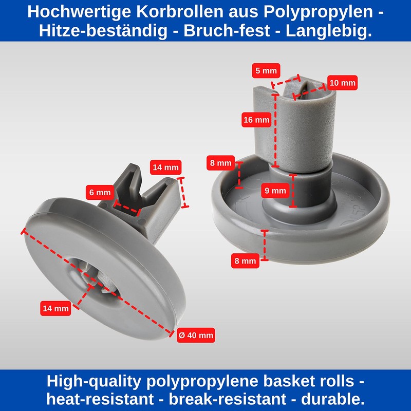 - Dishwasher rollers made of robust plastic: these lower basket rollers for dishwashers are delivered in grey - in addition, the basket rollers are made of heat-resistant plastic.