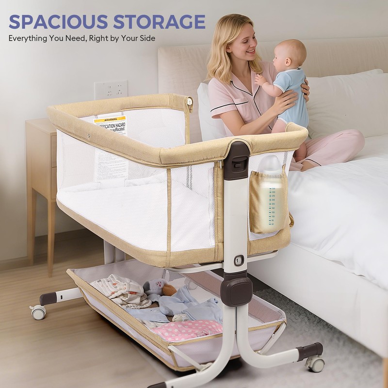MOMFANN Baby Bassinet Bedside Sleeper, Upgraded Stability Bedside Crib with Full Mesh Sides, Soft Sheet, 6-Height Adjustment, Storage Basket, Easy Folding Portable Bassinet for Newborns, Oatmeal