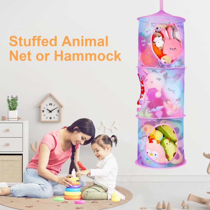 Stuffed Animals Storage: Creative collapsible design and customized unique colors, hanging use and maximizes utilization of standing space, different direction for putting items, convenient to use, easy fold when not use, saving space