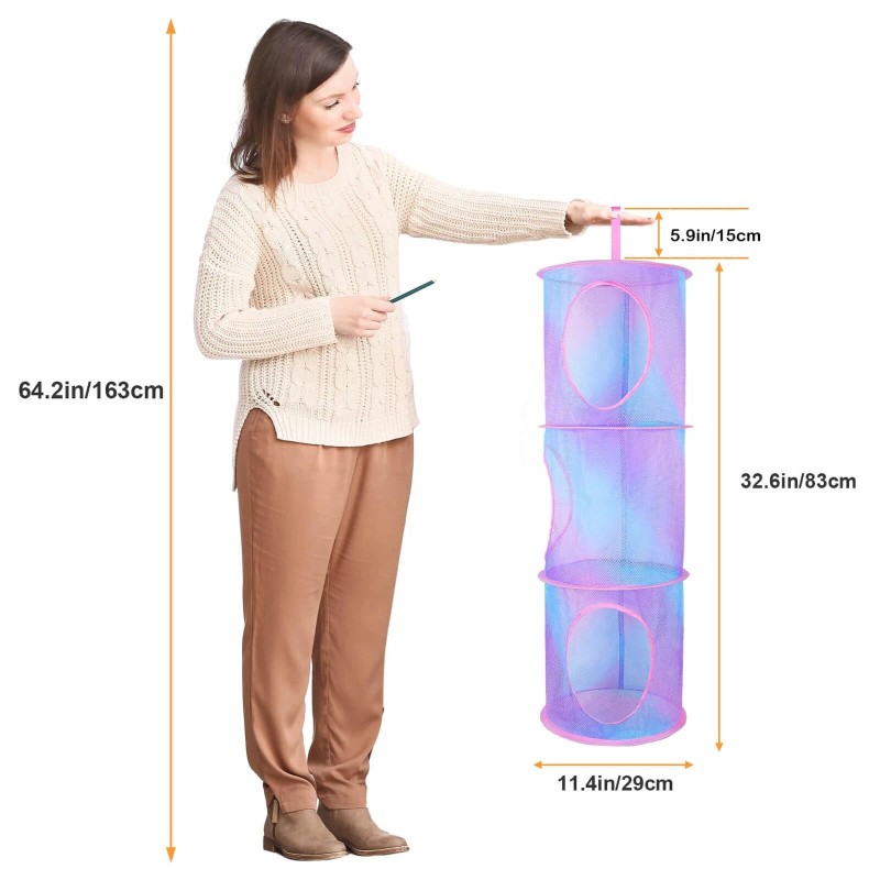 Size and Package: Stuffed animals organizer holder 3 tiers size is 11.4 " x 11.4 " x 32.6 ", 4 tiers size is 11.4 " x 11.4 " x 43.3 ", 5 tiers size is 11.4 " x 11.4 " x 55 ", top with wide loop, easy to open and close, for hanging; No special installation is required, and hanging it on a hook or a closet at will, the package contains 2 pcs of stuffed animals storage