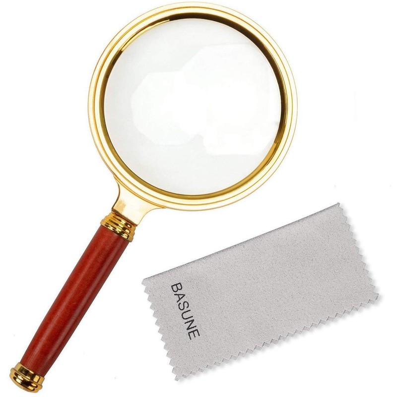 BASUNE 10X Handheld Magnifier, Reading Magnifier Loupe Glasses 10X with Rosewood Handle for Book and Newspaper Reading, Insect and Hobby Observation, Classroom Science (Clear, Plastic Frame)