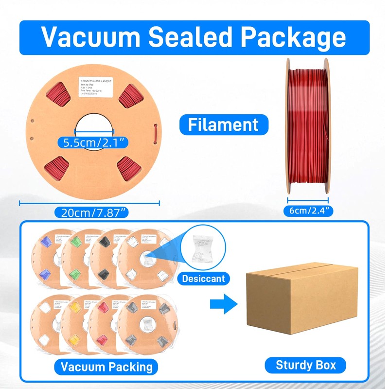 - Vacuumed Sealed Packaging: Filament Net Weight: 1KG. Filament comes in a sealed vacuum bag with a desiccant bag, easily keep your 3D printer filaments at an optimal storage condition and free from dust or dirt before opening the vacuumed sealed packaging