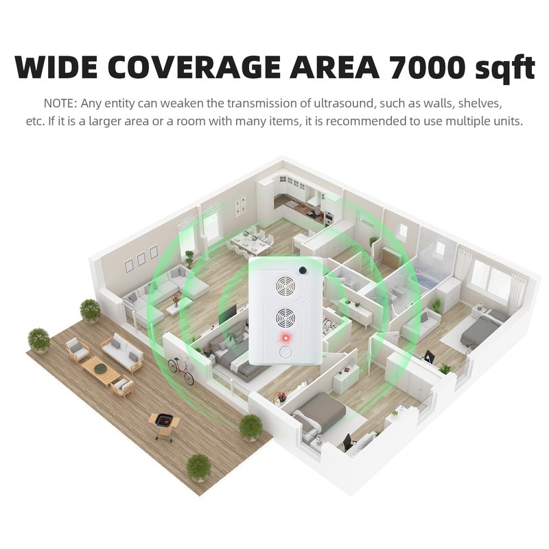 A: This product is very friendly to humans and pets. The ultrasonic frequency it emits is beyond the audible range of humans and most pets, and will not cause any harm to human ears and the hearing of pets. At the same time, the device does not use any chemical agents and will not produce harmful odors or substances, ensuring the safety of the living environment for humans and pets.