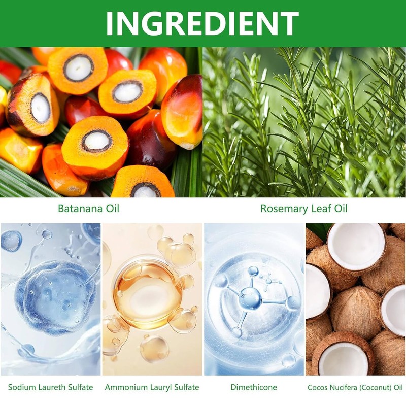 - 【Apto para todo tipo de cabello】El champú Batana con extracto de romero es seguro y suave, apto para todo tipo de cabello y piel