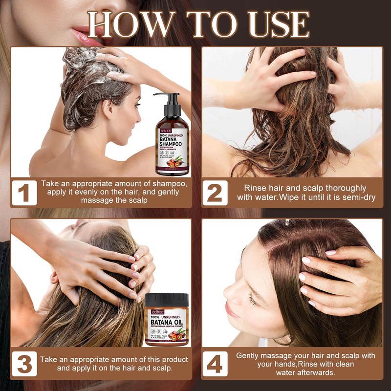 - ANWENDUNG: 1. Waschen Sie Ihr Haar mit Batana-Shampoo. 2. Tragen Sie eine angemessene Menge Conditioner auf Ihr Haar und Ihre Kopfhaut auf und warten Sie eine Weile. 3. Spülen Sie es aus.