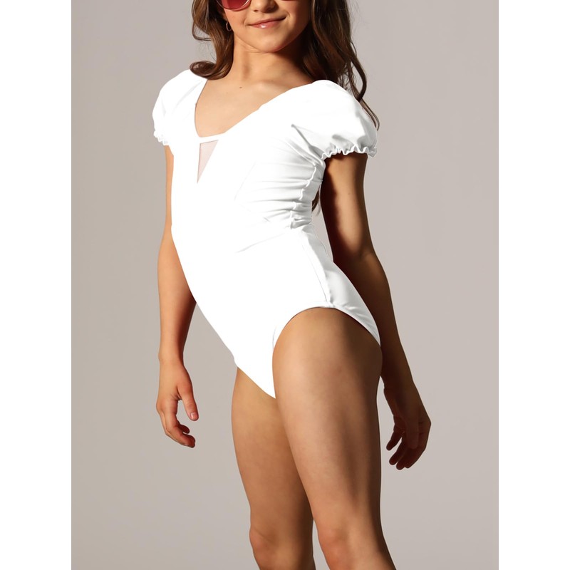 Batermoon Girls Dance Ballet Leotards Gymnastics Short Puff Sleeve Mesh V Back Outfits 5-14 Years White