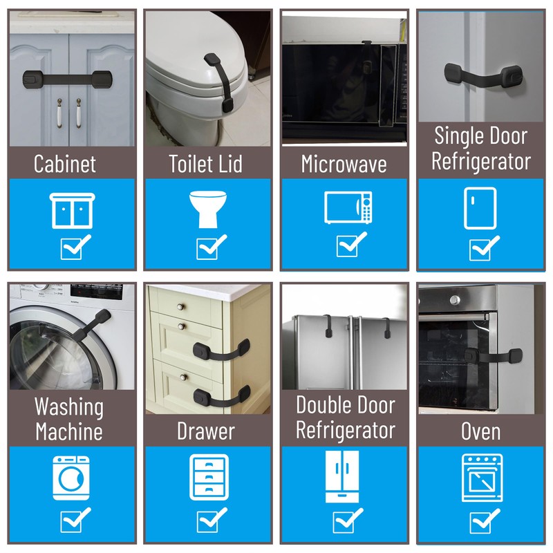 - Ensure your baby or toddler is safe by securing cabinets, appliances, drawers, refrigerator, trash bin, toilet seat, and more. With these child locks, you can keep your stuff neatly organized as your curious child cannot reach them.