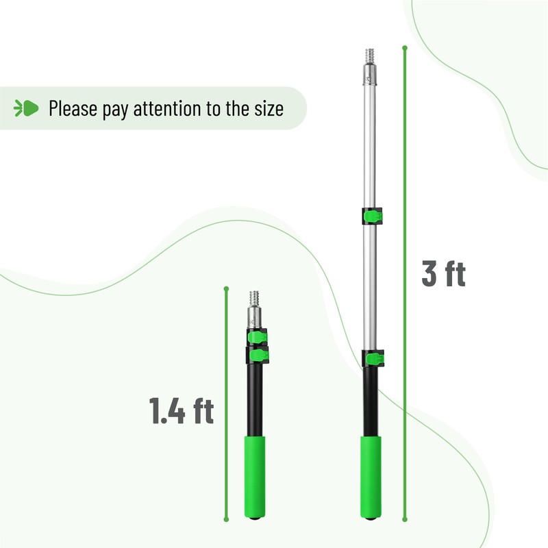 - The adjustable length extends from 1.4 feet to 3 feet, making it easy to reach high or hard-to-access areas without needing a ladder, while still remaining compact and easy to store.
