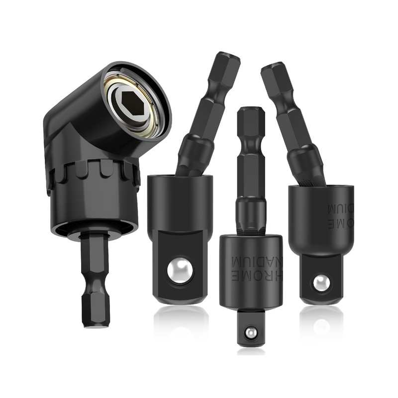 Bates- Flexible Drill Bit Extension Set with Right Angle Drill Attachment, 4 pcs, 360° Rotatable 1/2" 1/4" 3/8" Impact Socket Adapter Set, 105 Degree Right Angle Drill Adapter