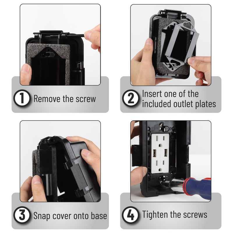- The cover features a weather-tight gasket and includes mounting screws for quick and easy installation, offering a secure seal to prevent moisture and dirt from entering the outlet.