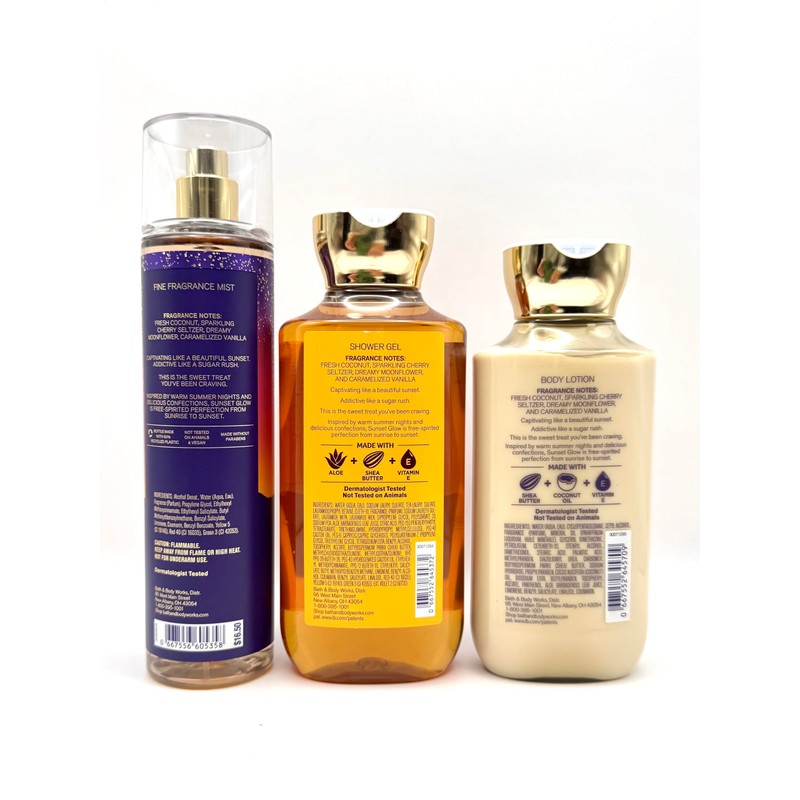 - COMPLETE SET: Includes an 8 fl oz Fine Fragrance Mist, 10 fl oz Shower Gel, and 8 fl oz Body Lotion in the captivating Sunset Glow fragrance