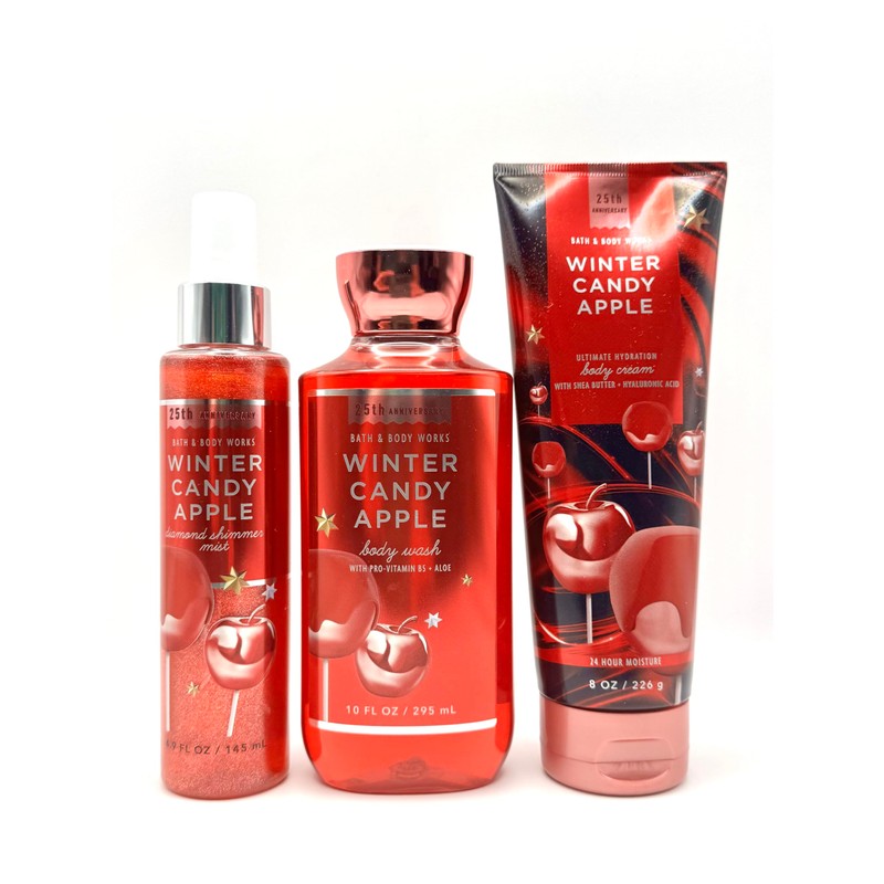 - COMPLETE SET: Features a 4.9oz Diamond Shimmer Mist, 10oz Body Wash, and 8oz Body Cream from the 25th Anniversary Winter Candy Apple collection