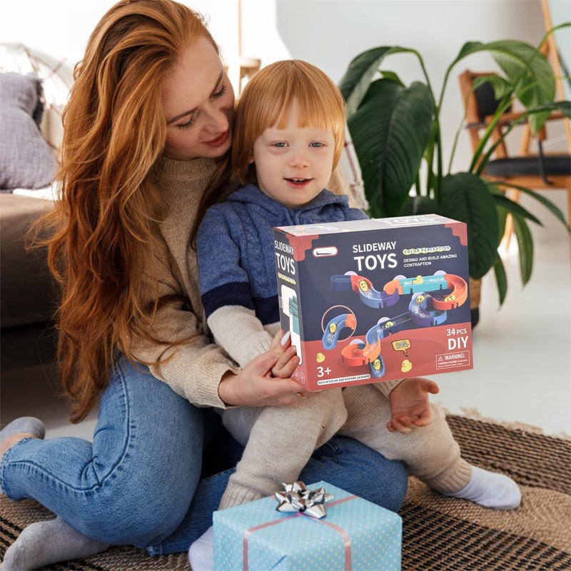 - Customisable: the set contains 34 pieces, including colourful tracks, suction cups and non-slip toys. Create endless configurations - with curves, straight, up or down - and let the 6 toys slide down the tracks, similar to a marble run.