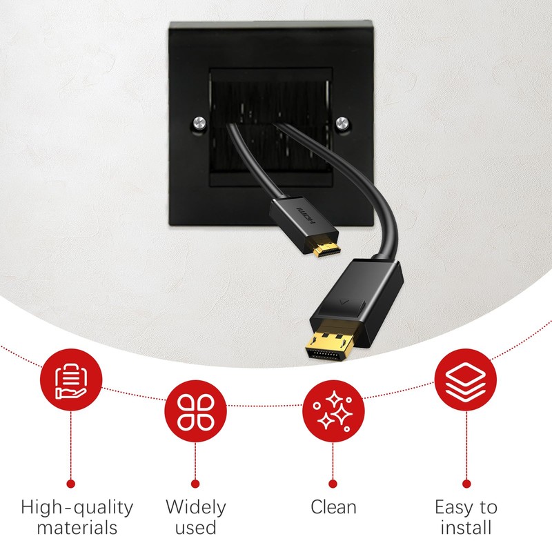 Dank des Staubfangmechanismus der Bürsten bleibt Ihr Zuhause auch bei der Kabeldurchführung sauber. Diese Wanddosen eignen sich für den Einsatz in Wohnzimmern, Büros, Heimkinos und überall, wo Kabel ordentlich versteckt und die Wandflächen sauber gehalten werden sollen.