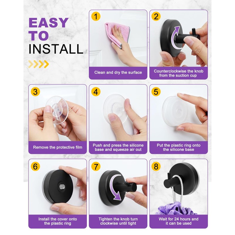 • 【Easy To Install】No Tools. No Screws. These bathroom suction hooks easy to install, with clear instructions provided. Rotate the knob clockwise for installation and counterclockwise for disassembly. (Attention: Need to wait for 24 hours to complete the installation)