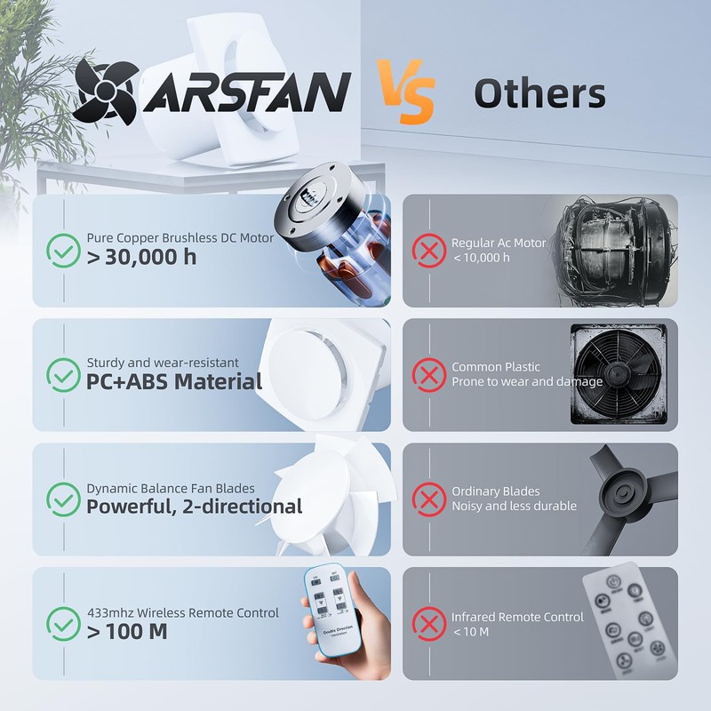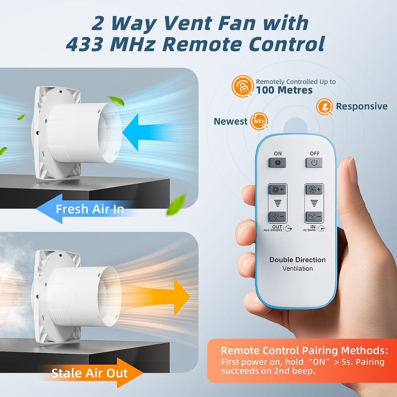 - 【433MHz Smart Remote Control】 The bathroom fan with remote control allows seamless control up to 100 meter range. It has a power - off memory function, automatically restoring previous settings after a restart.This smart feature makes it convenient for controlling vent fan operations from a distance. (Pairing: First power on, hold “ON” > 5s. Pairing succeeds on 2nd beep.)