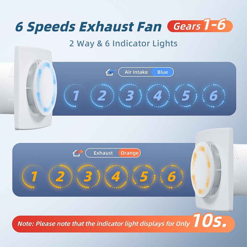 - 【2 Way Airflow (Intake/Exhaust)】 The ventilation fan features a reversible 2 - way airflow function, quickly removing odors & moisture. The blue indicator light signals fresh air intake, while the orange light indicates exhaust.Whether it's for a bathroom vent or other spaces, this feature ensures proper air circulation. (Note: Indicator light lasts only 10 sec)