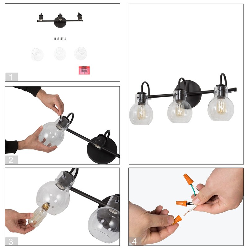 - [ Super Easy Installation ]: The installation can be finished no more than 15 minutes. This black bathroom light fixtures include all necessary mounting hardware to ensure quick installation. You just need to assemble the glass shade, screw bulbs, then mount up and wire up.