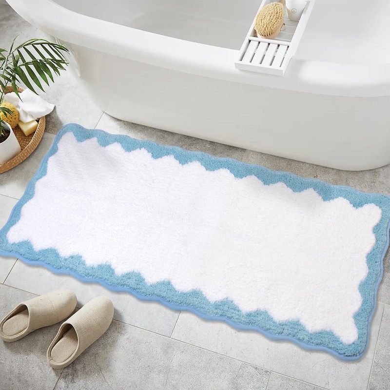 - FUN RUG DESIGN:Our bathroom floor mats are available in 3 sizes:16" x 24". 20" x 32". 18" x 47". With irregular wavy design and unique flocking process,the scalloped bath mat enhances the aesthetic design of your bathroom decoration!Whether your bathroom style is modern, traditional, or eclectic, this bath mat's timeless appeal and versatile aesthetic make it the perfect addition to create a serene and elegant ambiance in your space.