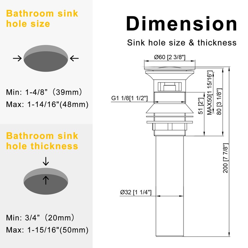 - 【Applicable Size】: This product use with bathroom sinks without overflow (above-countertop vessel sink, vanity sink, etc.). Sink hole size Min1-4/8"(39mm) Max1-14/16”(48mm), thickness Min3/4“(20mm)Max1-15/16”(50mm).