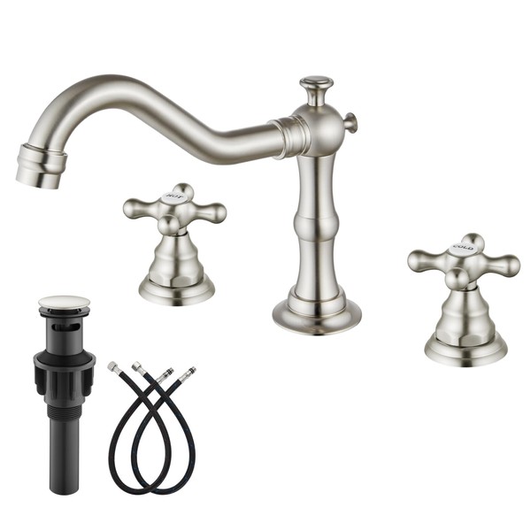 gotonovo Bathroom Sink Faucet Widespread Brushed Nickel Double Mixing Tap Deck Mount Cross Knobs 3 Hole with Pop Up Drain