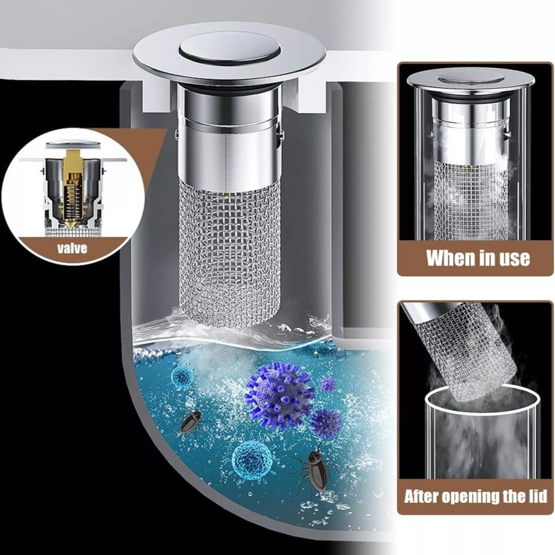 - UPGRADED 2-IN-1 DESIGN -- The pop-up bathroom sink drain strainer features an anti-clogging basket inside, combining a stopper and a strainer in one. This design stores water and prevents clogging by trapping hair, debris, and valuable items like jewelry rings before they flow down the drain. The removable extended basket provides extra space to collect debris and makes cleaning even more convenient.