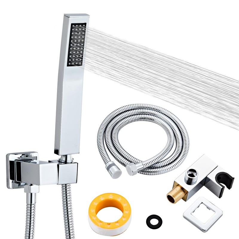 Bathroom Square Chrome Solid Brass Hand Held Shower Head With Wall Connector and Hose System Wall Mount Handheld Showerheads Set