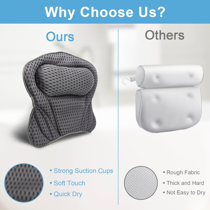- 8 STRONG SUCTION CUPS: Bath tub pillow equipped with 8 powerful suction cups, our bath pillow stays firmly in place to prevent slipping and sliding. Enjoy a relaxing bath without worrying about your pillow moving around.